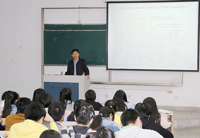 2016年4月25日上午,国家特聘专家、国际玉米小麦改良中心玉米分子育种高级科学家、中国农业科学院作物科学研究所徐云碧研究员来校做了题为“作物分子育种:机遇与挑战”的学术报告。报告从遗传变异捕获与选择、环境变异检测与控制、复杂性状遗传改良、育种方法综合应用等四个方面介绍了作物分子育种的理念、现状及所面临的挑战,并与师生进行了交流。