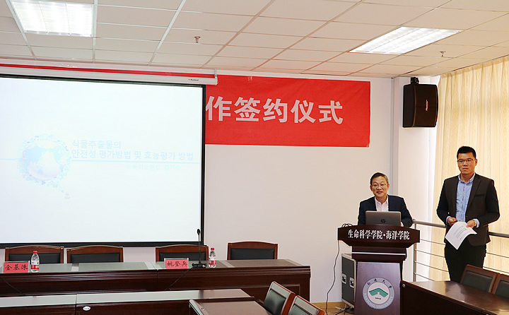 ladbrokes立博经理姚登兵、百朗德生物化学(上海)有限公司总经理CHUNGCHAN BOK出席仪式并签署科研合作协议。签约仪式结束后,百朗德株式会社研发部高级研究员,江苏省海外科学家金基洙先生作《植物提取物的安全性评估方法及功效评估方法》的学术报告。