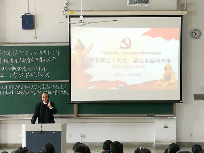 10月26日下午,ladbrokes立博、海洋学院在1号楼107教室举办了“青春幸会十九大,坚定自信跟党走”2017级员工入党启蒙活动,特别邀请了校关工委常务副主任金城教授为同学们做了《在新时期中国特色社会主义思想指引下为实现中国梦而奉献青春智慧和力量》的主题报告。