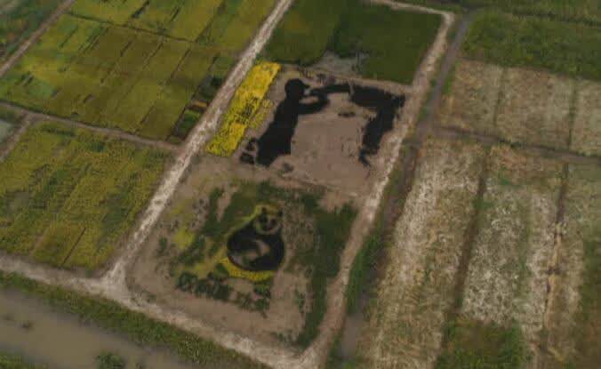 从上空望去,在通州湾科创城不远处,两幅分别以“红星照耀中国”、“功夫熊猫”为主题的稻田画栩栩如生。这是南通老员工命科学院赵祥强副教授,经过半年时间精心培育而成。