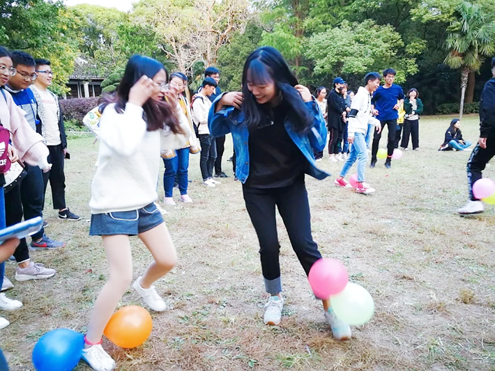 活动开始前,同学们在草坪上集合,随即进行了抽签分组,之后开始素质拓展活动。此次活动包括五个游戏项目和一个集体活动。五个游戏项目为:坐地起身、搭桥过河、解手链、泡泡糖、燃烧卡路里。在“坐地起身”活动中,两名同学背靠背坐于草地,通过臂膀力量相互冲击来站立起来,大家两两结合,共同协作,完成活动。还有“搭桥过河”、“解手链”与“泡泡糖”等活动项目,需要同学的默契配合与极高的灵活度来完成。而在“燃烧卡路里”活动中,高频率地抖动使大家的身体得到了充分舒展。集体活动为“踩气球”,被选中的同学们精神抖擞,竭尽全力地要踩掉对方脚边的气球,而剩余同学则围成一个圆圈,为他们加油助威。