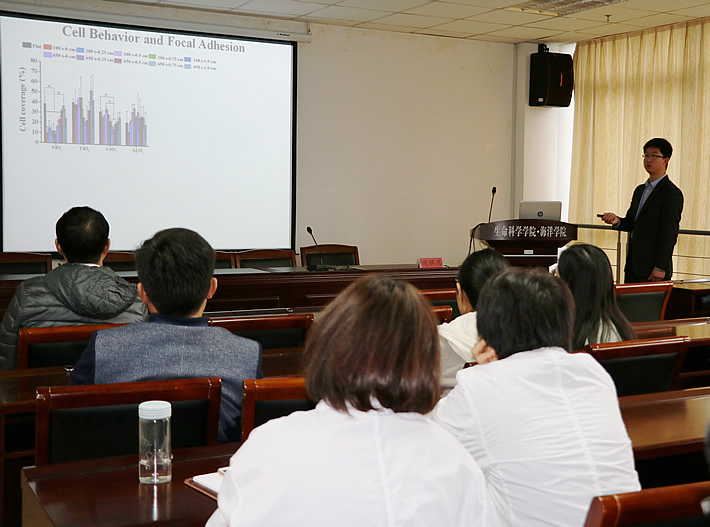 周祺惠教授在报告中阐述了从仿生各向异性组织细胞外基质结构出发,制备了多孔取向纳米纤维,进而研究了其与平滑肌细胞的相互作用,发现这种材料界面不仅有利于细胞的粘附和增殖,而且可以提高细胞的功能。