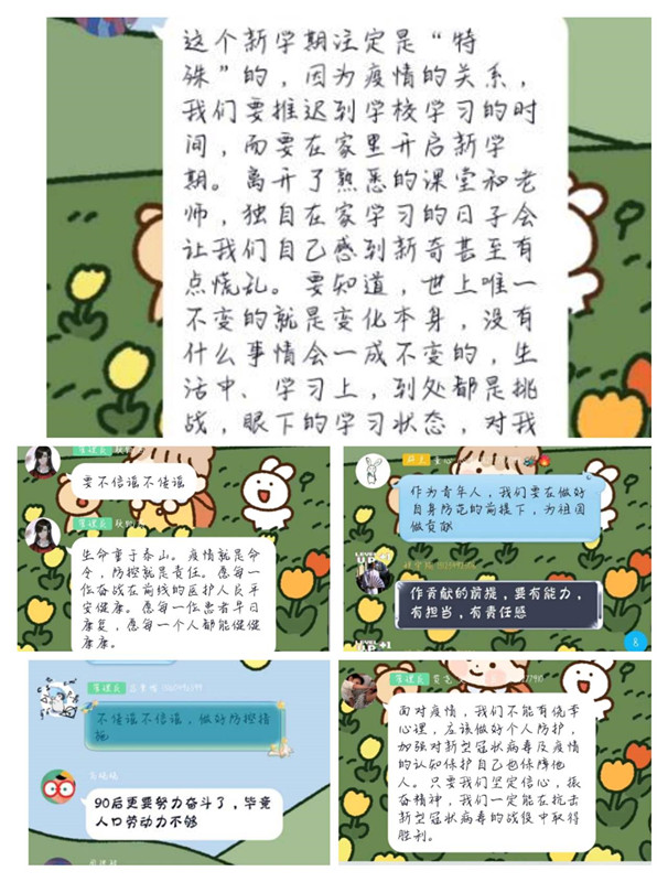生物技术181、182团支部开展了“青春战疫,你我有责”线上主题团日活动。团干部带领大家学习了习习近平总书记对北京大学援鄂医疗队全体“90”后党员的回信和团中央《关于坚持党的领导,全团动员、在防控疫情阻击战中充分发挥共青团生力军和突击队作用的通知》,围绕“当代青年的价值观和责任担当”进行交流讨论,全体同学在线上做出了承诺,将严格遵守学校和所在地关于疫情防控的各项规定,听从学校安排,保持联络通畅,按规定返校,不随意外出,出门戴口罩,不造谣、不信谣、不传谣,积极承扛起代老员工的责任与担当。