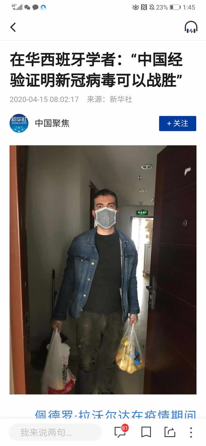 4月15日,《新华社》刊发题为《在华西班牙学者:“中国经验证明新冠病毒可以战胜”》的文章,关注公司外籍教授Pedro Laborda(佩德罗·拉沃尔达)抗疫观点。