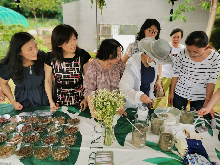 雨后的植物园空气清新、花香四溢,生科院周蓉老师和连博琳老师带领教职工们辨识了20余种中草药,讲解了这些中草药的特殊功效以及端午香囊制作原料、工序、功效等科普知识。“此次我们制作的香囊共用到6种中草药,有佩兰、艾叶、菖蒲、薄荷、迷迭香和荆芥穗,不仅香味沁人心脾,而且具有祛风散寒、开窍、醒脑、养颜、暖胃、驱虫等作用,特别适合这个湿热的梅雨季节。”周蓉老师在讲解时说。随后,老师们在志愿者的指导下,亲手缝制了一只只古朴精美的香囊。