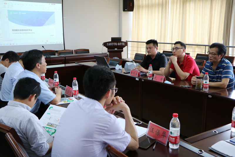 经理姚登兵首先代表学院向王凯盛博士一行的到来表示欢迎,并从学院专业建设和人才培养、科学研究和产研融合等方面介绍了学院的基本情况。 王凯盛博士分别介绍了清华大学无锡应用技术研究院、生物育种研究中心的建设过程、组织架构、技术创新能力、成果转化以及服务地方企业等情况,他们主要致力于具有自主知识产权及世界领先水平的特色生物设备及产品的研究和开发,有着面向产业、多学科交叉的科研与特色技术服务的优质平台。在交流环节,双方就生物育种的研究现状、育种方式及手段,常压室温等离子体ARTP技术、微液滴高通量筛选技术及产业化等方面,进行了深入细致的探讨和答疑。