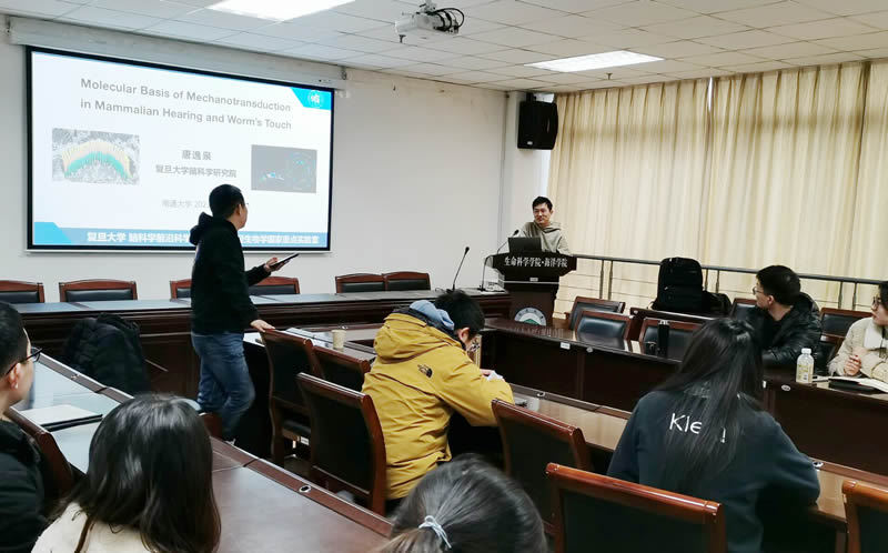 1月5日,复旦大学脑科学研究院博士生导师唐逸泉教授,来学院作题目为“Molecular basis of mechanotransduction in mammalian hearing and worm’s touch”专题学术报告。唐逸泉教授首先介绍了历年来有关感觉生物学的相关诺贝尔奖。进而引入听觉并详细将讲解了哺乳动物耳蜗基本结构以及不同区域的功能。然后讲解了目前听觉最大的难题:内耳毛细是如何将声音机械信号转导为电信号?针对此问题,唐逸泉教授结合自己团队近年来的研究成果重点讲解了内耳毛细胞机械通道可能构成原件(TMC、CIB以及Ankyings等)以及相关实验证据,为听觉领域的相关研究提供非常好的思路。