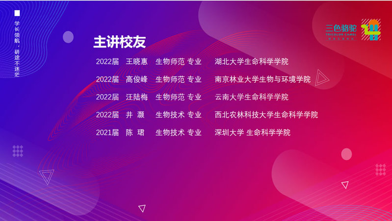 本次分享会邀请了来自南京林业大学、湖北大学、云南大学、西北农林科技大学、深圳大学的5位公司毕业优秀员工,为学弟学妹们传授考研经验。成功上岸南京林业大学的高俊峰从目标院校选择、考研时间线、备考方法等方面分享了自己的考研经验;湖北大学的王晓惠和云南大学的汪陆梅从考研与就业的选择、考研动机、考验心态、参考书目选择、信息资料收集等方面进行了详细的讲解;深圳大学的陈珺和西北农林大学的景灏从应试技巧、报考专业前景、英语和政治的学习等方面为学弟学妹制定了学习计划,还分享了考研调剂的心得。会后,同学们和学长学姐就考研中的相关问题进行了热烈的交流讨论。