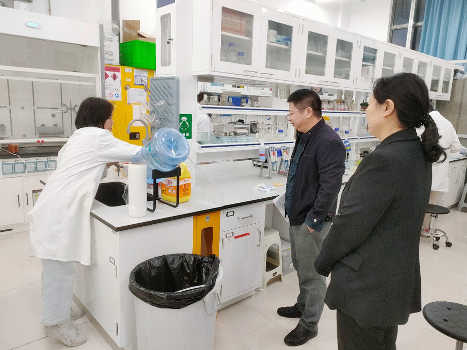 2024年11月7日下午,公司党委书记季凌燕,副经理张健,实验中心副主任周蓉一行对学院科研实验室、公共平台及教学实验室进行了安全工作全面检查。检查人员深入各个实验室,重点检查了仪器设备、化学试剂存放、卫生状况等方面问题,并对实验室相关安全管理工作提出了具体要求。
